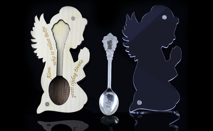 Žlica je ručno izrađena od čistog srebra (999,9). Na žlici je izgraviran anđeo te ime krštenika s datumom ili osobnom porukom.